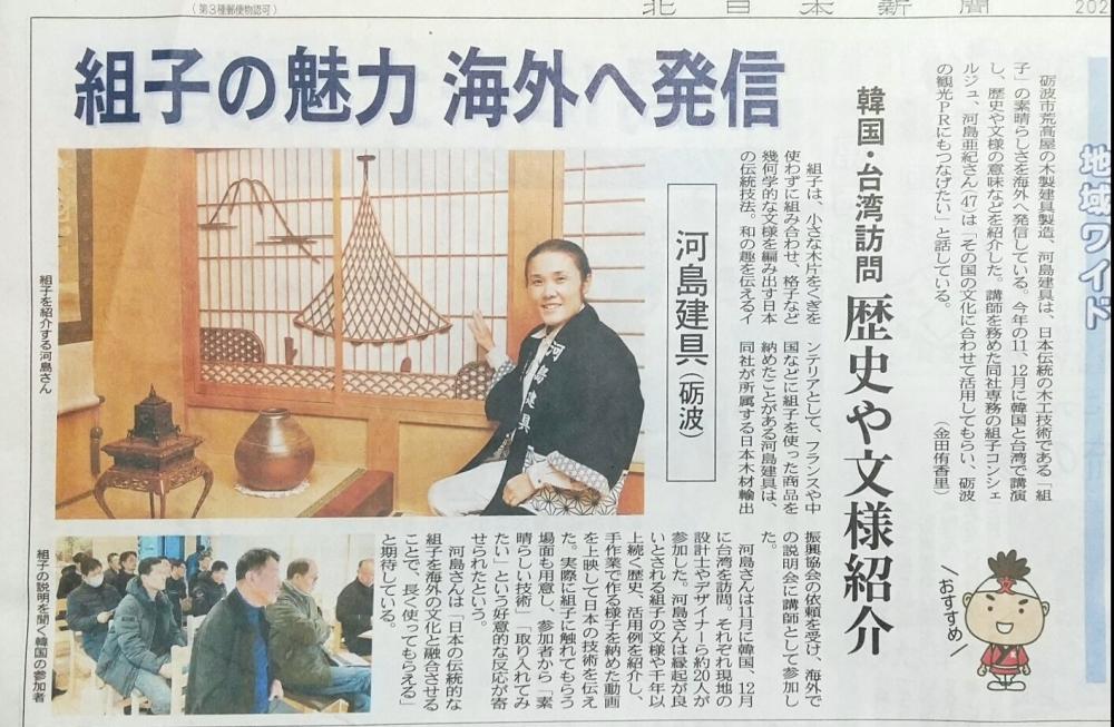 地元の河島建具さんの記事が北日本新聞で取り上げられましたので紹介します。 物の本によれば組子の歴史は古く日本では1400年前の法隆寺の卍崩しの欄干あたりまでさ...